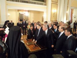 Türkiye’de Kur’an üzerine yemin ne zaman?![]() Hasan Hacı'nın haberi: Yunanistan'da dün açıklanan muhafazakar Yeni Demokrasi (ND) ve sosyalist PASOK tarafından kurulan iki partili yeni kabine bugün öğlen saatlerinde yemin ederek göreve resmen başladı. Başbakan Antonis Samaras’ın da hazır bulunduğu yemin töreni Cumhurbaşkanı Karolos Papulyas’ın huzurunda yapılırken, Bakanların İncil’e el bastığı dini yemin törenini Atina Başpiskoposu İeronimos yönetti. Cihan |