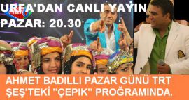 Pazar günü Şanlıurfa'dan canlı olarak yayınlanacak. Ahmet Badıllı Pazar günü akşam saat 20:30'da Şanlıurfa'da Topçu Meydanında Trt Şeş'te Aydın Aydın'ın Sunduğu Çepık Proğramına Katılacak.Sanat yaşamında kendisine başarılar diliyoruz. |