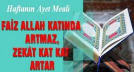 Haftanın Ayet Meali![]() Bismillahirrahmanirrahim Cenab-ı Hak (c.c), Rum Suresi 39. ayetinde mealen şöyle buyuruyor: İnsanların mallarında artış olsun diye verdiğiniz herhangi bir fâiz, Allah katında artmaz. Hâlbuki Allah’ın rızâsını isteyerek verdiğiniz herhangi bir zekâta gelince, işte onlar, (sevablarını ve mallarını) gerçekten kat kat artıranlardır. |