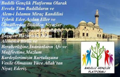 Aziz,Sıddık Kardeşlerim Sizin Miracınızı Tebrik ve Miraç Sahibinin (a.s.m) Sünnet-i Seniyesine Bizi ve Sizi Tam Muvaffak Eylemesini Rahmet-i İlahiyeden Niyaz Ediyoruz. (Bediüzzaman)![]() Badıllı Gençlik Platformu olarak evvela tüm Badıllıların ve tüm Alem-i İslamın Miraç kandilini tebrik eder,açılan eller ve gönüllerden dökülen niyazlar hürmetine,Miracın insanlığın barış ve huzuruna, İslam aleminin birlik ve beraberliğine,inananların afv ve mağfiretine,mazlum kardeşlerimizin kurtuluşuna vesile olmasını Yüce Allah’tan niyaz ederiz. BADILLI GENÇLİK PLATFORMU |