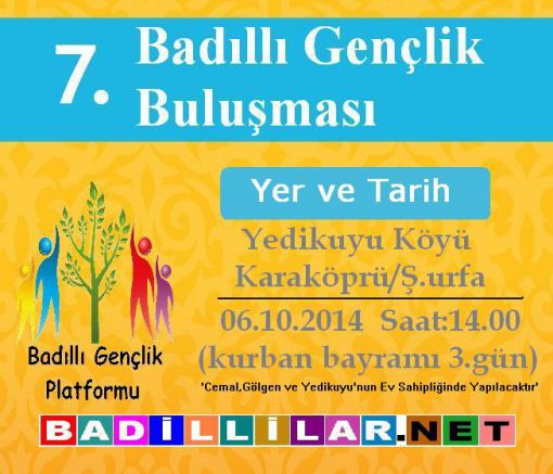 Badıllı Gençlik Platformu tarafından organize edilen Badıllı Gençlik Buluşmalarının 7.si Kurban bayramının 3. günü Yedikuyu köyünde yapılacaktır.Tüm Badıllılar davetlidir.